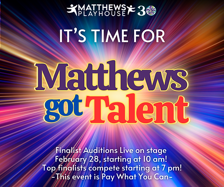 Matthews Playhouse invites performers of all ages and talents to participate in our first-ever Matthews Got Talent! Singers, dancers, musicians, actors, comedians, magicians, and variety acts are all welcome to showcase their skills on stage for a chance to win cash prizes and perform at our 30th Anniversary Gala.